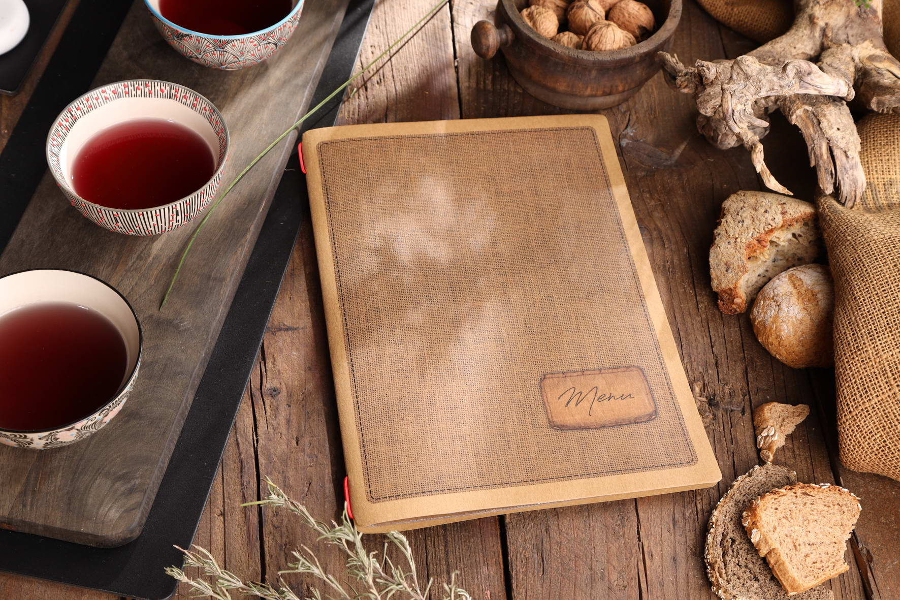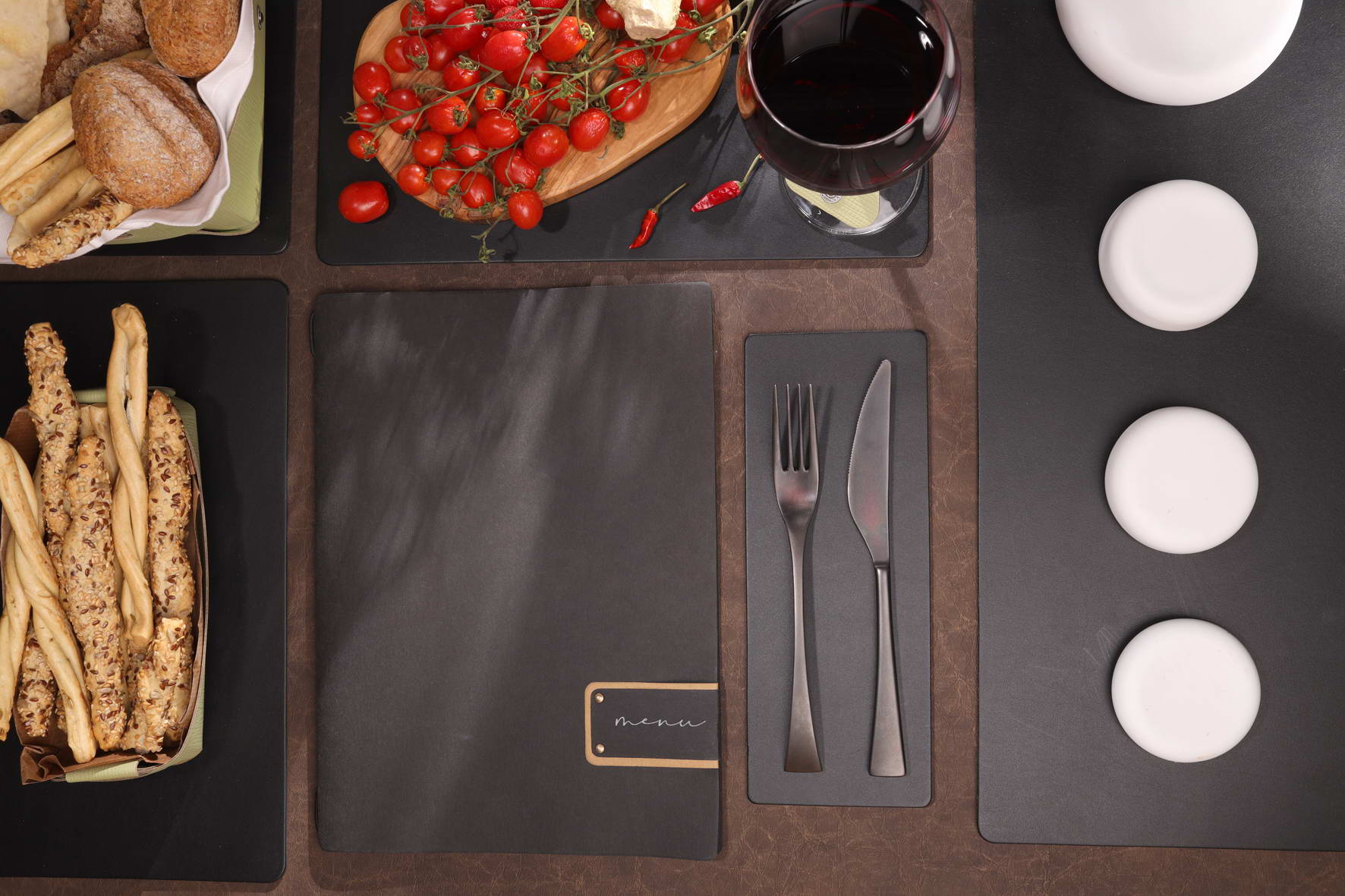La ligne ECOMODA, de son côté, utilise des tons naturels de terre, conciliant ainsi mode et durabilité. La personnalisation des porte-menus ECOMODA est réalisée par une impression à effet craie en blanc sur des étiquettes PATCH noires. La configuration standard comprend l’inscription du menu sur la couverture, quatre enveloppes intérieures et une reliure élastique.